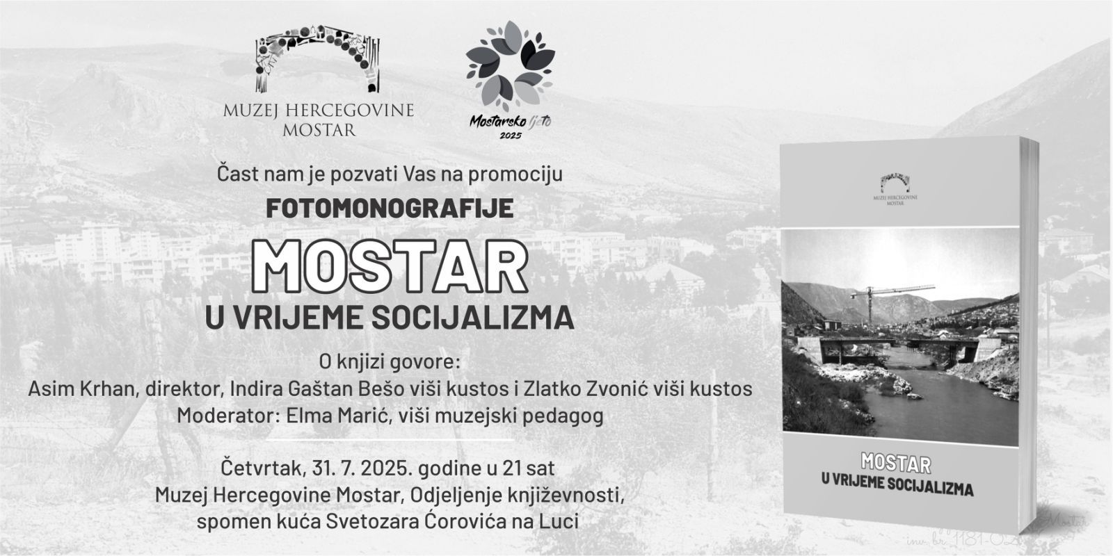 Fotomonografija sa preko 500 fotografija Mostara iz 60-tih i 70- tih godina prošlog stoljeća predstavlja dugogodišnji projekat i digitalizacije foto zbirke Muzeja Hercegovine Mostar.Fotografije su grupisane u nekoliko cjelina od privrede, kulture, obrazovanja, turizma te svakodnevnog života. Fotomonografija se izdaje u sklopu obiljezavanja 75 godina rada Muzeja.Read More