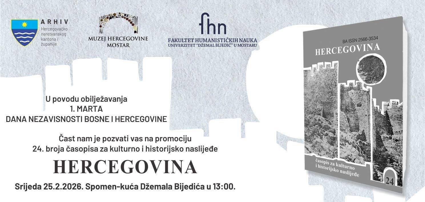 U povodu obilježavanja 1. marta, Dana nezavisnosti Bosne i Hercegovine, Arhiv Hercegovačko-neretvanske županije, u saradnji s Muzejom Hercegovine Mostar i Fakultetom humanističkih nauka Univerziteta “Džemal Bijedić“ u Mostaru, organizovao je u srijedu svečanu promociju 24. broja časopisa za kulturno i povijesno naslijeđe “Hercegovina”.Read More